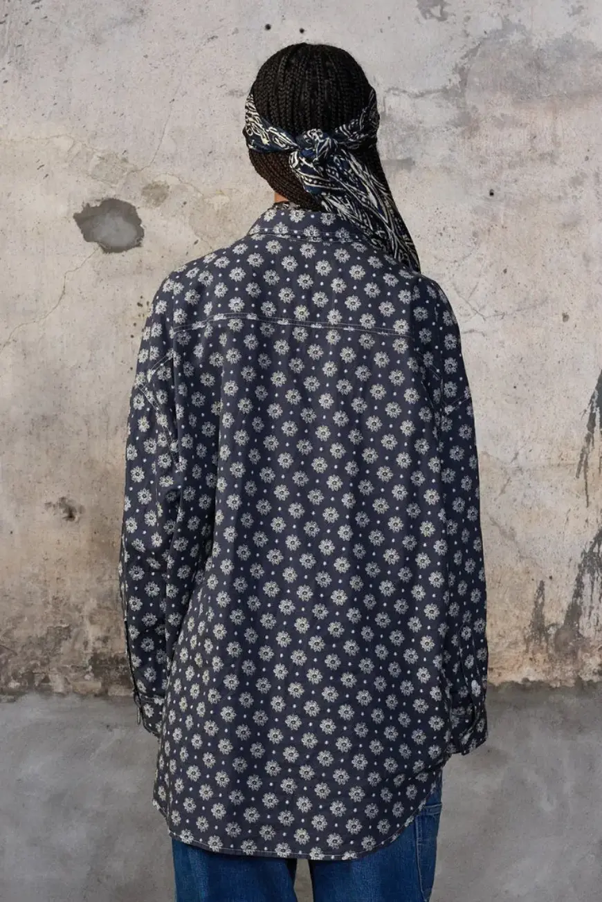 Button up shirt with pintuck detailing at the placket featuring an indigo blossom print.