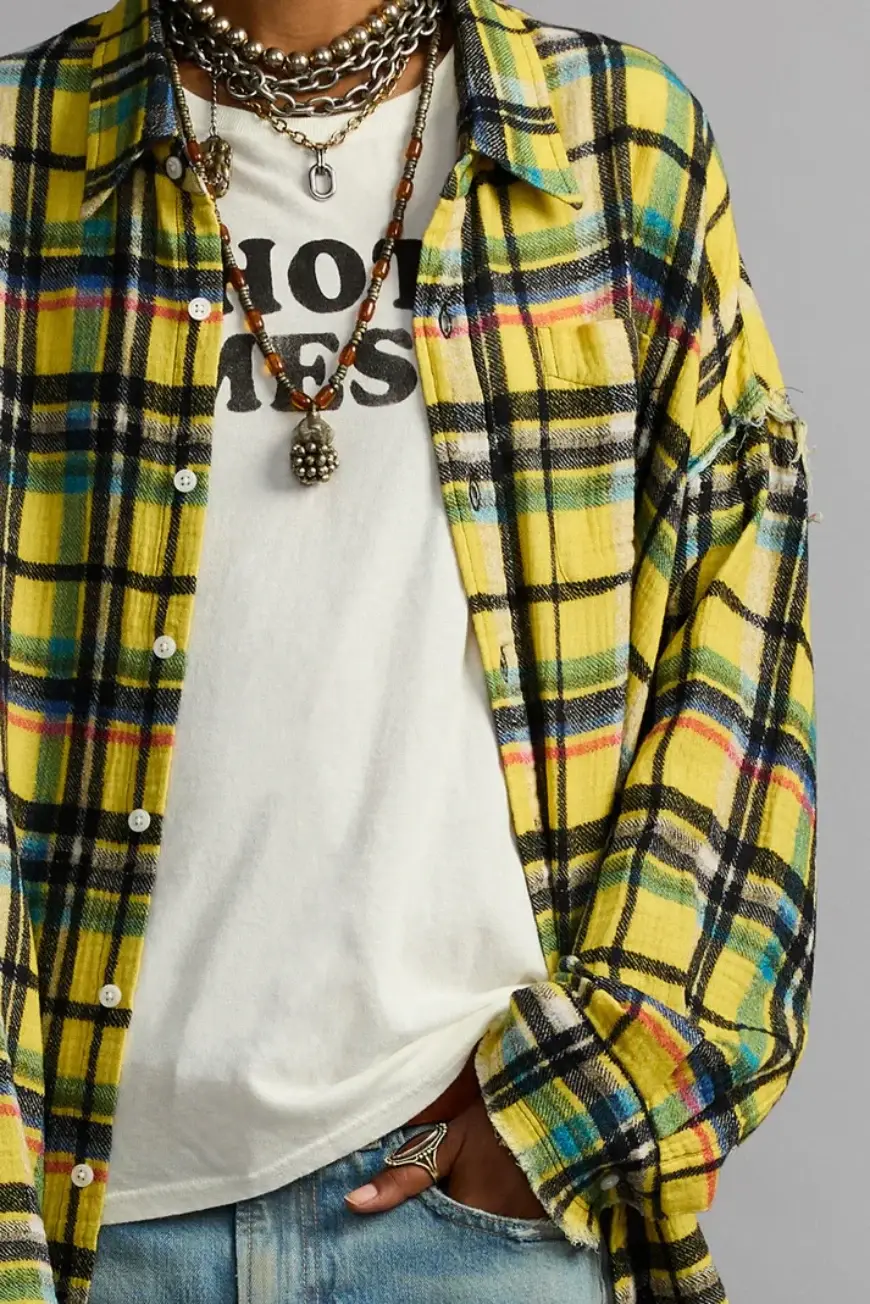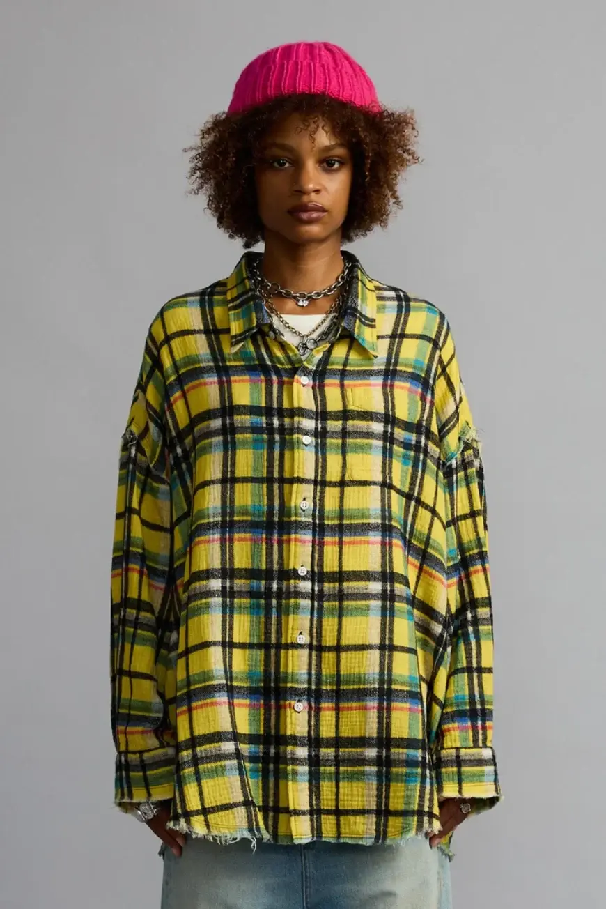 Shredded seam drop neck shirt built with Japanese cotton slub plaid.