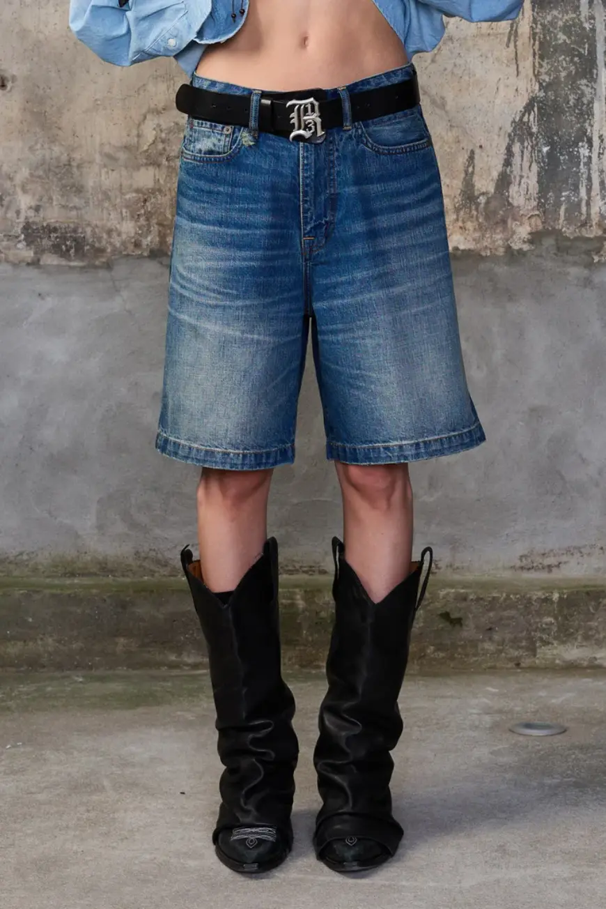 Relaxed fit short with a long rise made with 10 oz. Japanese selvedge with a dark indigo wash and heavy wear pattern.