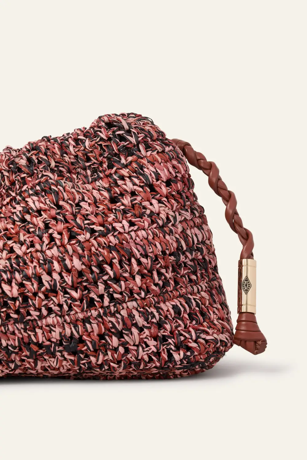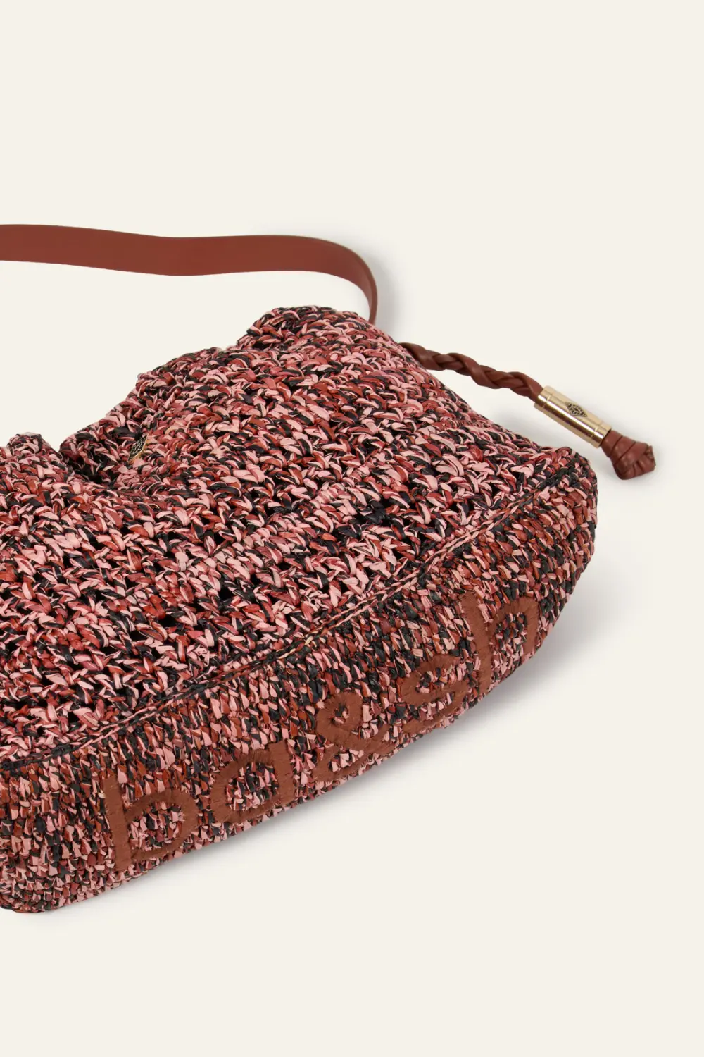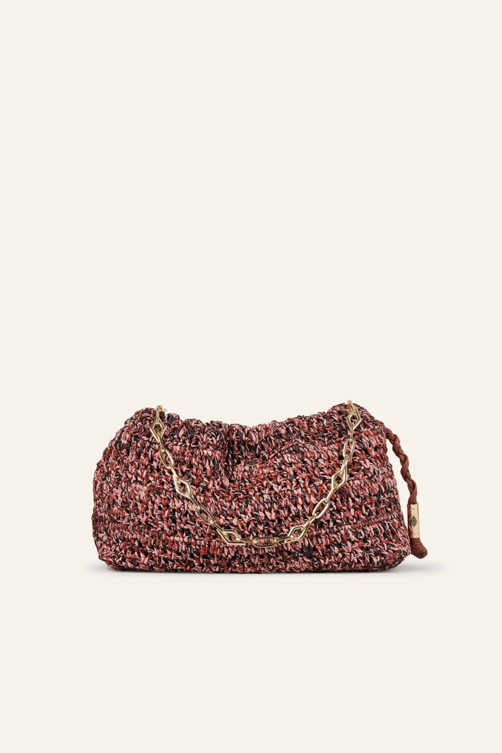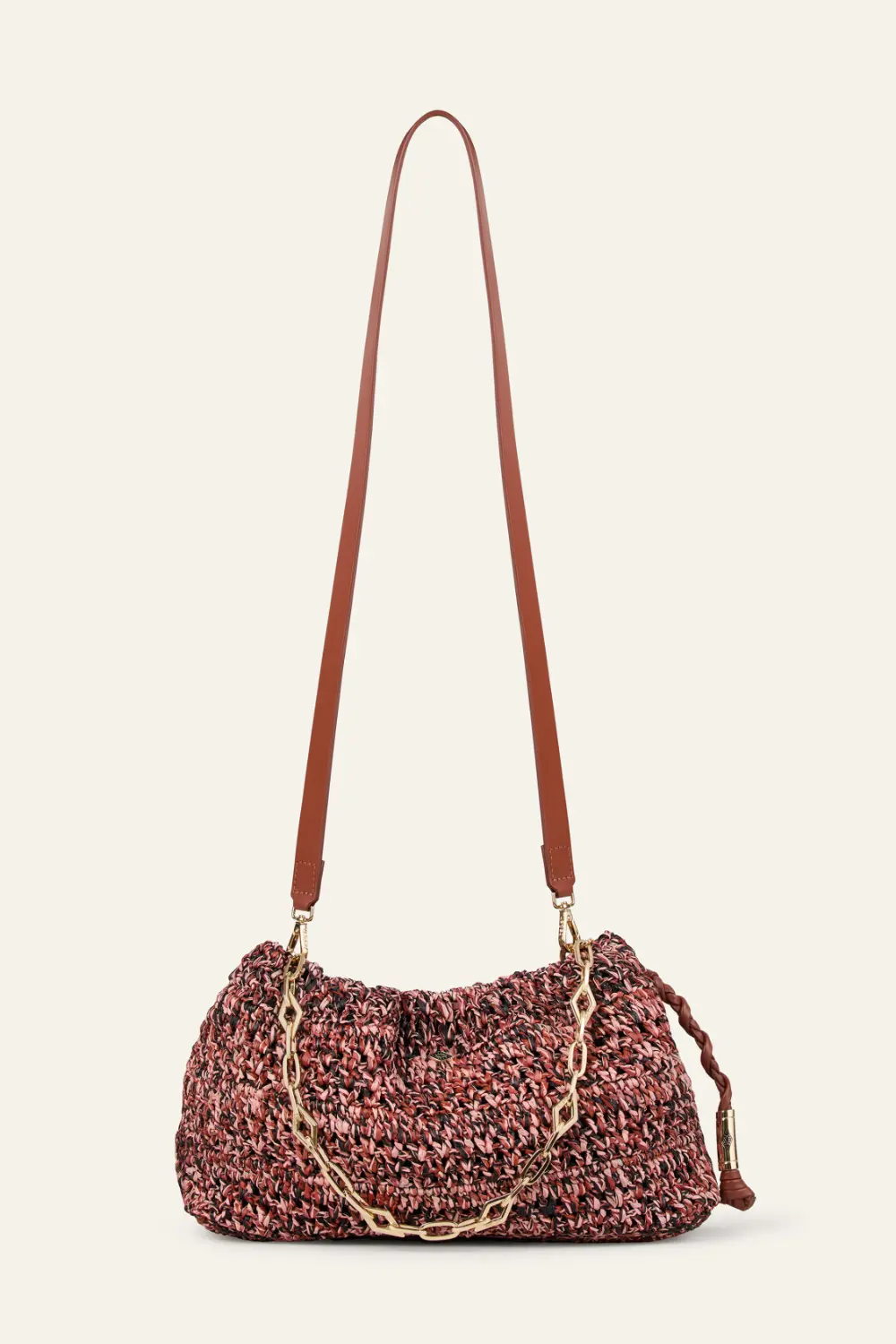 עשוי 100% ראפיה בעבודת יד באי מדגסקר, עם רצועת כתף מעור נשלפת ושרשרת נשיאה – לנשיאה ביד, על הכתף או באלכסון
