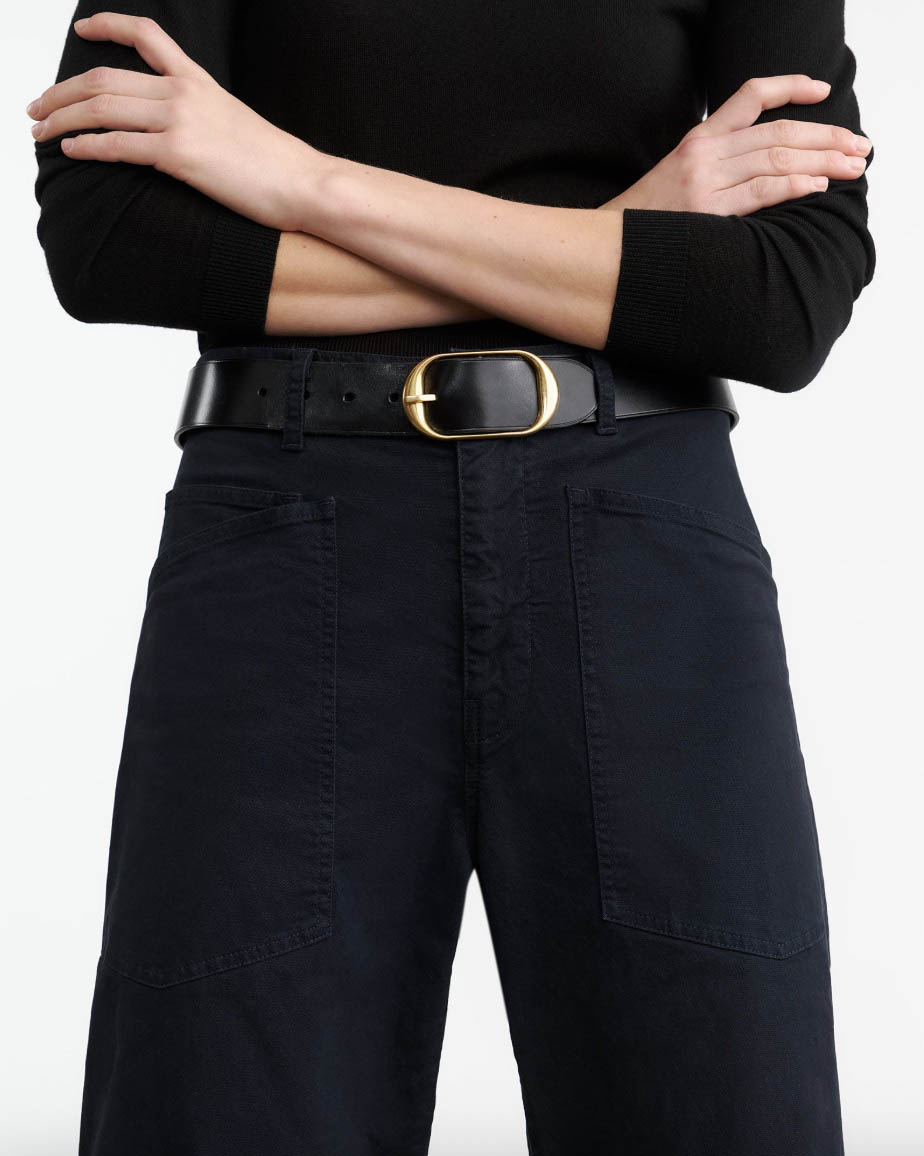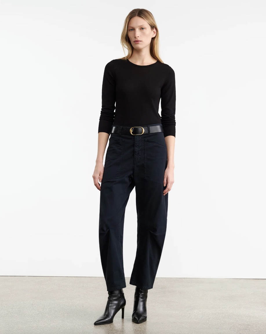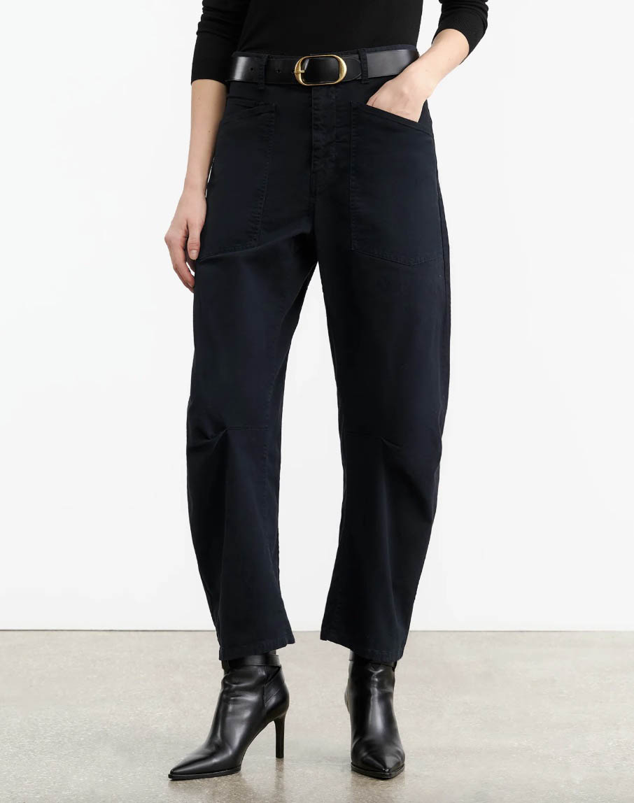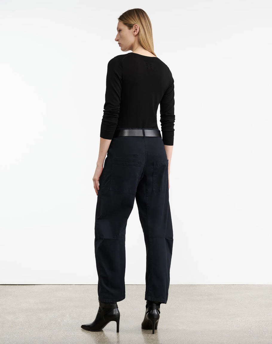 Mid-rise, relaxed fit barrel leg pant. Uniquely curved silhouette. Seam detail at knees. Gusset at inseam. Zip fly. Hidden hook-and-bar closure. Hidden stay button closure. Top-stitched front and back patch pockets. Belt loops.
